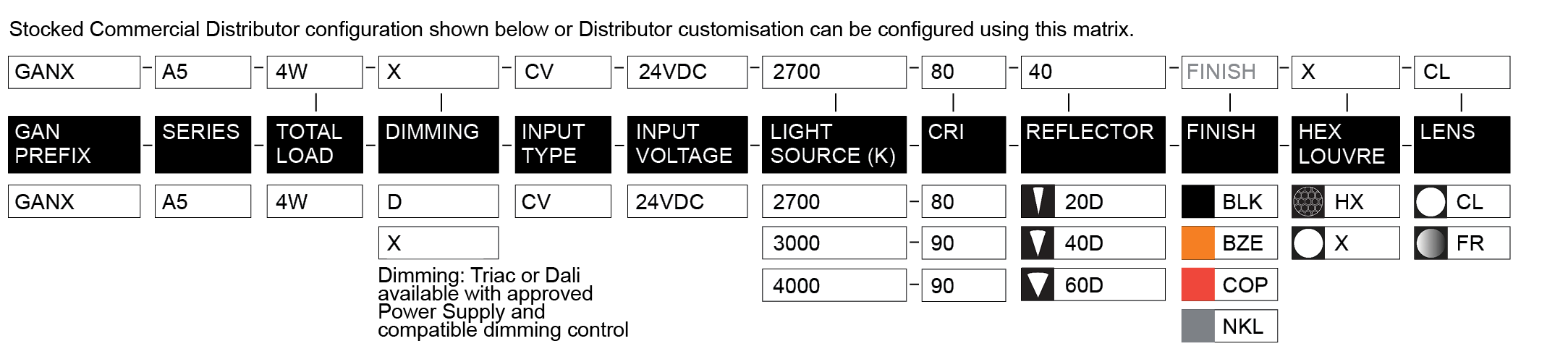Designed to suit a variety of residential and landscaping applications the Standard range is readily available from your local Distributor. To identify your unique ordering code simply add your chosen finish to the end of the code matrix as shown below.