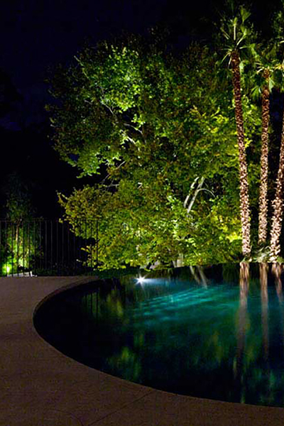With a sensitivity to maintain the existing mature trees, these were retained giving the landscape height. Accent lighting was used to highlight the large trees. Gardens at Night were involved with all the external lighting including the custom lamps on the patio to the sweeping staircase and hidden courtyards.