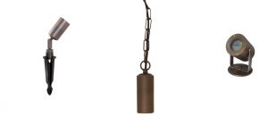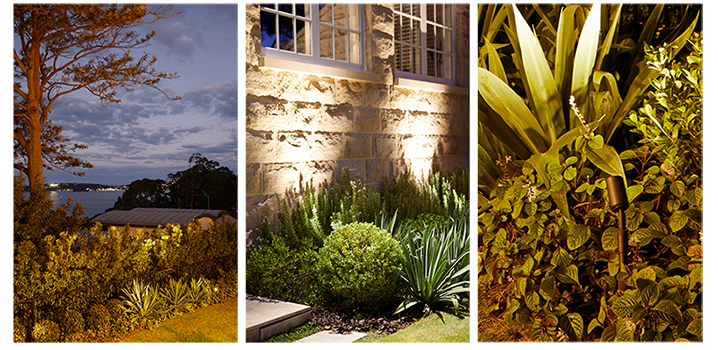 The textured sandstone walls on the lower terrace are illuminated with Accent lights that create a dramatic effect. Accent lights on Risers are a versatile solution for re-positioning lighting above growing foliage which help light the boundaries at night.